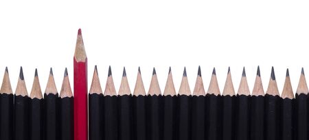 One red pencil between row of black pencils