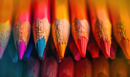 Brightly colored pencils are lined up on a vibrant red surface, showing a range of hues. The setup is ideal for art projects, school activities, or creative designs, inviting inspiration.