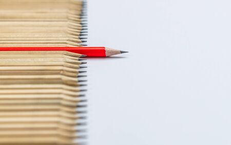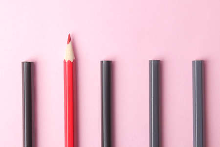 red pencil and gray pencils on a white paper background. Leader concept, different, unique