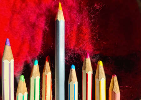 Set of color pencils on red background