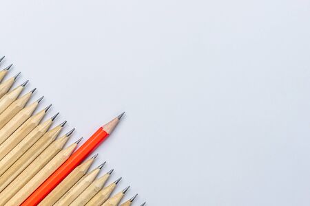 Red pencil standing out from crowd of plenty identical black fellows on white table. Leadership, uniqueness, independence, initiative, strategy, dissent, think different, business success concept