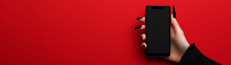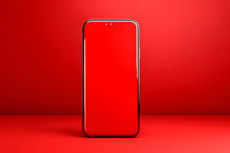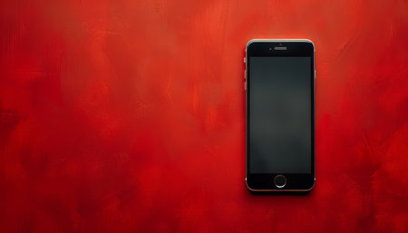 A sleek black smartphone with a blank screen on a vibrant red background. Ideal for marketing and advertising campaigns, this modern device exudes sophistication and elegance. Copy space.