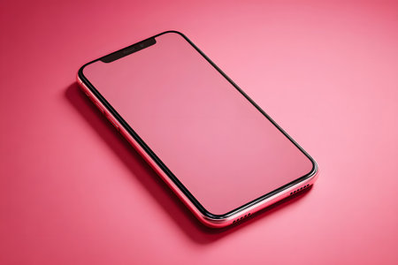 Realistic smartphone blank screen mockup on red background. Mobile phone template. Space for text. Generative Ai.
