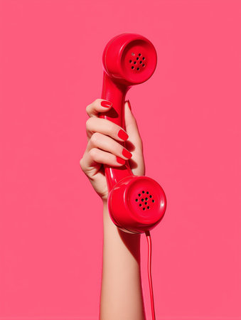 A hand with red nails grasps a classic red phone against a pink background, creating contrast.