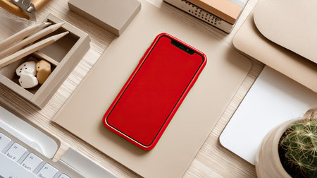 A vibrant red smartphone rests on a minimalist workspace, surrounded by stationery and decorative items, showcasing modern design and simplicity.
