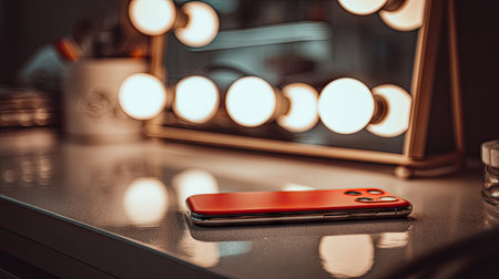 A vibrant red smartphone placed on a sleek vanity table under warm light bulbs, showcasing modern design paired with a cozy atmosphere. Perfect for lifestyle photography.