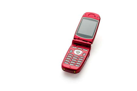 A sleek mobile phone stands upright against a bright red backdrop. The device has a blank screen, highlighting its modern design and color.