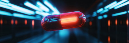 A vibrant neon pill hovers in a dark void, illuminated by futuristic lights, showing advanced sci fi medical design.