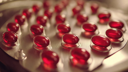 This image showcases a meticulous arrangement of shiny red capsules displayed on a textured blister pack, emphasizing health and wellness themes.