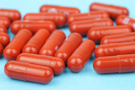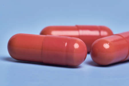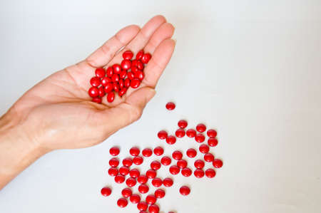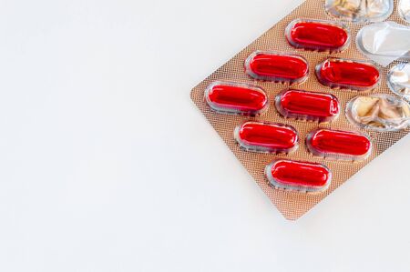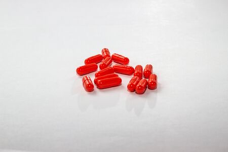 Macro of red capsules on white background. Copy space. Bunch of drugs, cold flu treatment. Coronavirus Covid-19