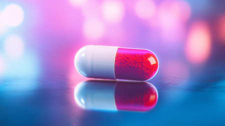 Pink and white capsule pill on reflective surface with colorful bokeh. Pharmaceutical concept
