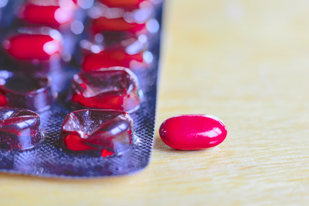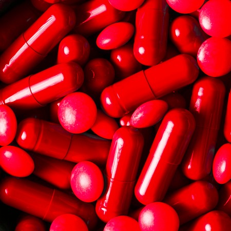 Many red capsule pills on a colorful background. Health supplements and medicines