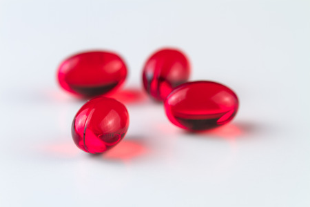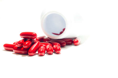 Selective focus, group of red medical pills isolated on white background.Health and medicine concept