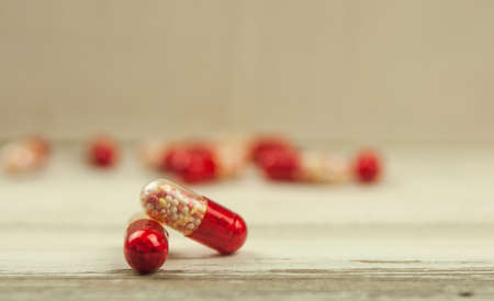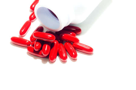 Red pills spilled around a pill bottle. Medicines and prescription pills flat lay background. Red medical capsules.