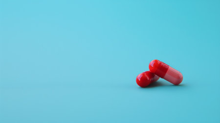 Two red pills are positioned on top of a smooth blue surface. The pills are round-shaped and vibrant red in color, contrasting against the calming blue background.