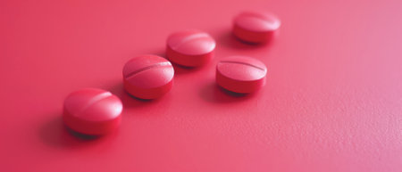 Five red pills, each with a single indentation, are arranged in a row on a solid red background. The pills are positioned in a slight arc, with the pills at either end of the row closer to the viewer than the pills in the middle.