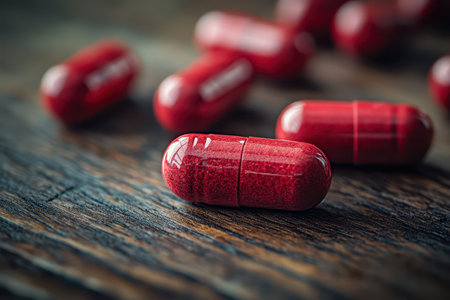 Red capsules are scattered on a rustic wooden surface showcasing their glossy finish and vibrant color in soft lighting.
