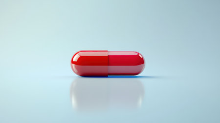 A red and white capsule pill resting on a reflective surface, symbolizing medicine and healthcare.