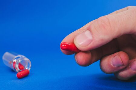 a hand holding a single, red capsule pill between the thumb and forefinger. The background is a plain, blue color which contrasts with the red of the pill and the skin tone of the hand