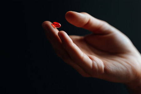 Red capsule balanced on fingertips against a dark background highlighting the contrast and tension of choice