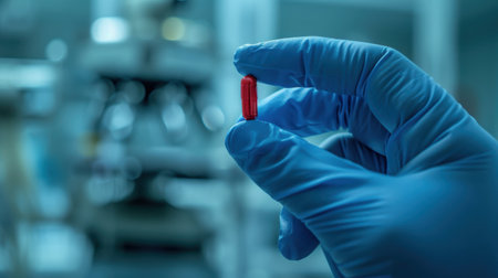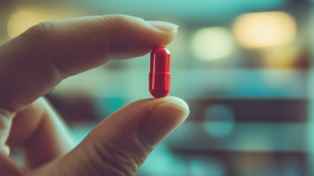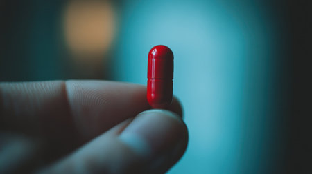 Hand holding a red pill against a softly blurred background, emphasizing the importance of the single capsule in a minimalistic and thoughtful composition.