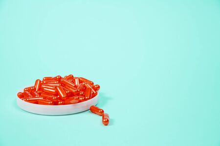 Heap of red pills on colored background. Tablets scattered on a table. Pile of red soft gelatin capsule. Vitamins and dietary supplements concept.