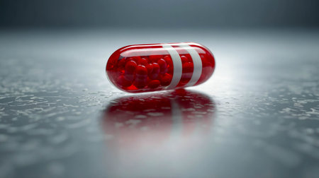 AI Generated. Red and white capsule pill with granules on reflective surface