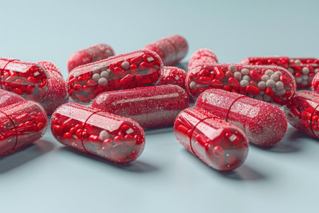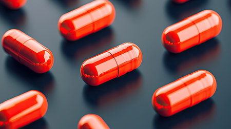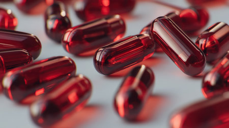 A visually striking arrangement of shiny red capsules displayed on a light background, perfect for illustrating concepts related to health and wellness.