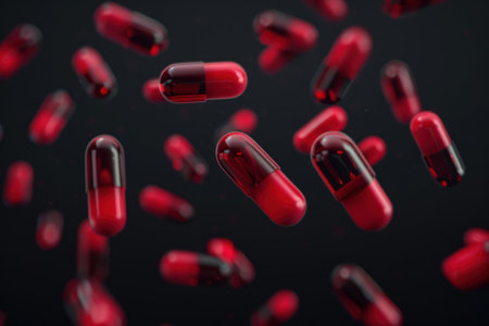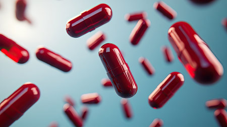 A dynamic scene featuring vibrant red capsules floating against a bright backdrop, representing health, wellness, and pharmaceutical innovation. Ideal for medical and health-related themes.