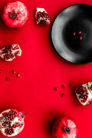 Pomegranate red fruit on red background, top view