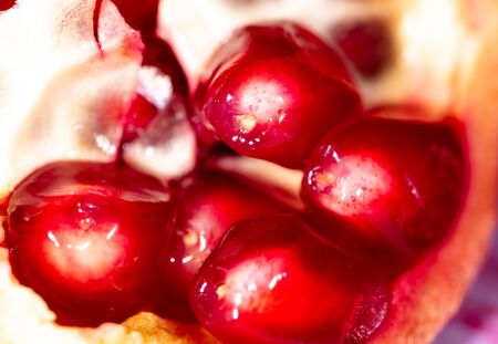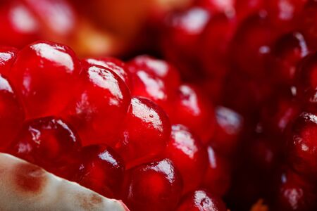 Red ripe and juicy seeds of fresh pomegranate fruit close-up. Macro