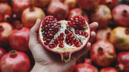A hand holding a halved pomegranate with seeds against a pile of pomegranates
