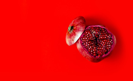 Ripe tasty red pomegranate fruit in a cut on a bright red paper background. top view. space for text