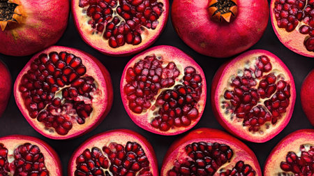 Pomegranate halves and seeds, providing a fresh and vibrant background.