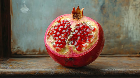 Close-up of a halved fresh pomegranate with vibrant red seeds on a rustic wooden surface. High detail and vibrant contrast.