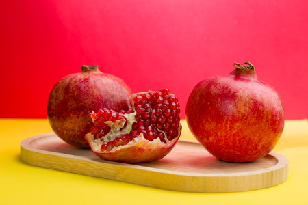 Ripe pomegranate fruit on a wooden board on a bright background