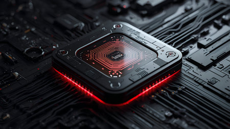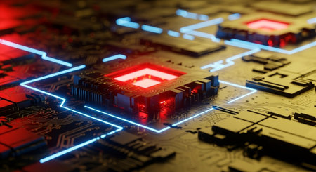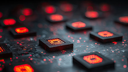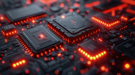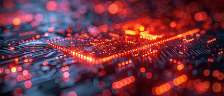 This image showcases a close-up view of glowing microchips amidst a dark circuit board, featuring red lights and intricate digital patterns, emphasizing technology.