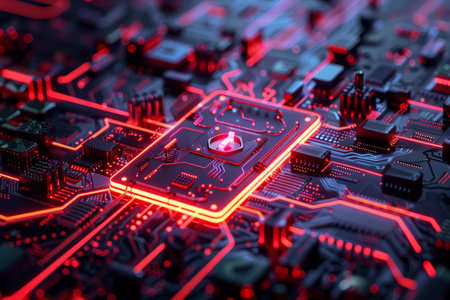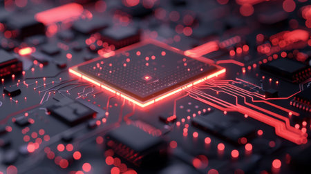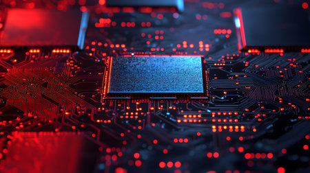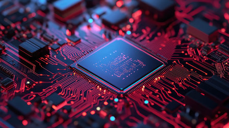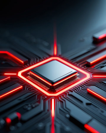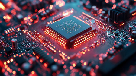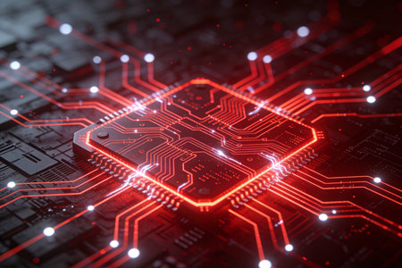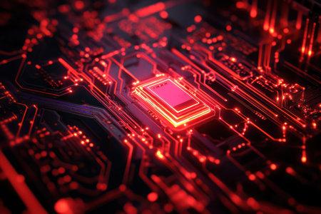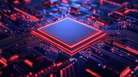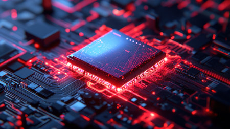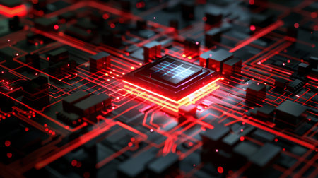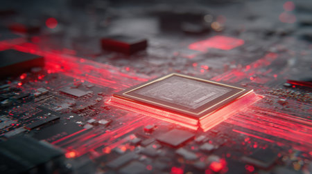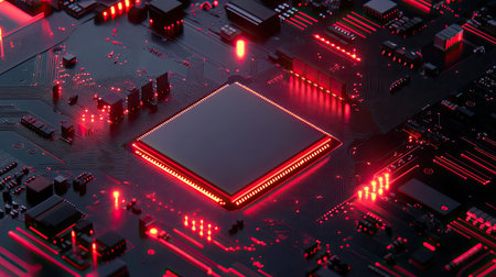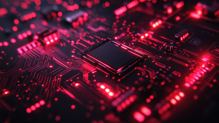 An intricate circuit board featuring vibrant red neon lights and a central microchip. This futuristic design symbolizes technology and innovation in electronics.