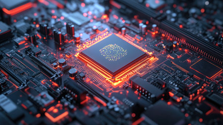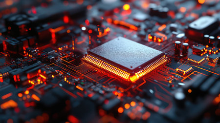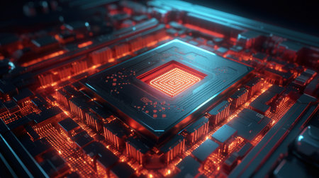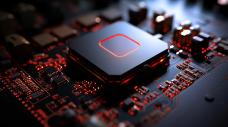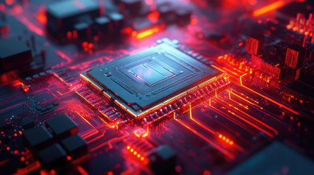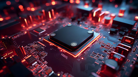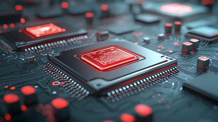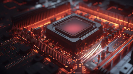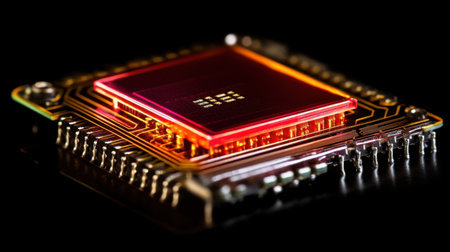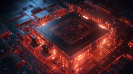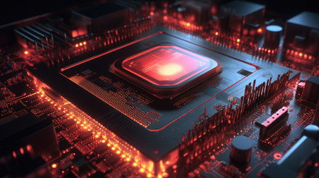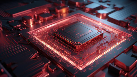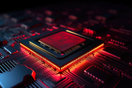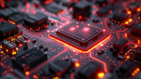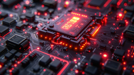 AI Generated. Central processing unit glowing red on circuit board closeup