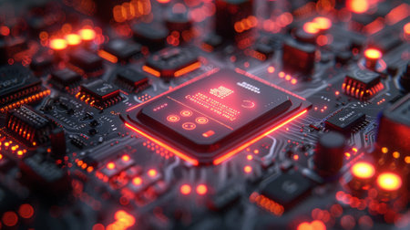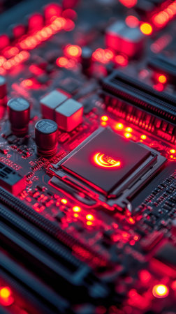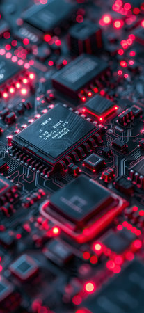 Explore a close-up view of an advanced circuit board featuring glowing red lights, showcasing intricate designs and modern technology elements in a futuristic setting.