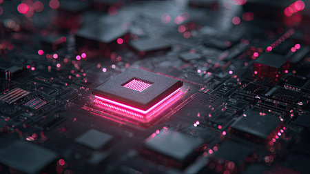 This image showcases a detailed view of a computer processor, featuring a central processing unit highlighted with pink and black glowing accents. The composition emphasizes intricate circuitry on a dark background, with a shallow depth of field. This visual is suitable for illustrating advanced technology, data processing, and electronic design in various commercial applications.