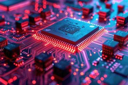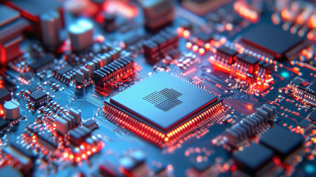 A brightly lit microchip stands out amidst a complex circuit board. Red and blue lights accentuate its design, creating an intricate and futuristic atmosphere in a dark setting.