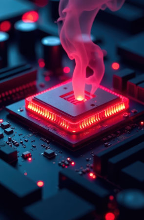 Pink smoke billowing from an overheating cpu on a motherboard highlights a critical malfunction within the electronic component, signaling potential damage and system failure