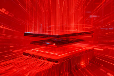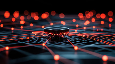 A stunning abstract representation of technology featuring a central chip connected with glowing red nodes, symbolizing data flow and connectivity in a digital world.