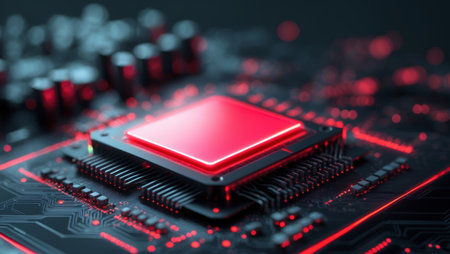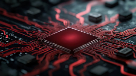 A close-up view showcasing intricate AI processors surrounded by glowing red circuit paths, emphasizing technology's elegance. The background is solid with vibrant details.