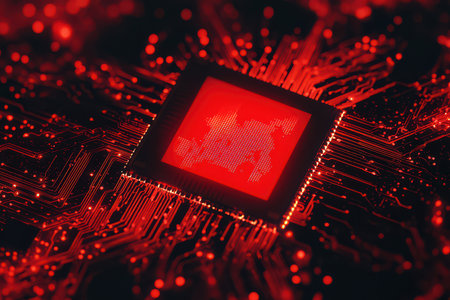 Detailed view of a microchip integrated onto a red illuminated circuit board.