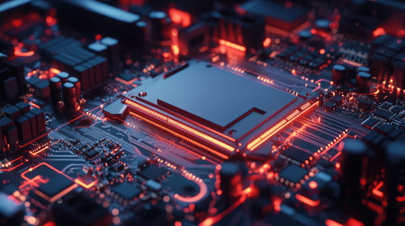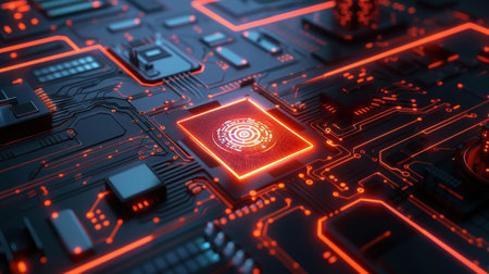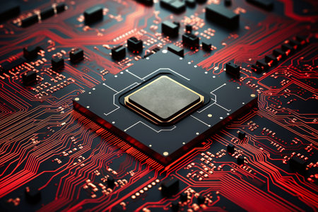 AI Generated. Futuristic Circuit Board with Red Lighting and a Central Component