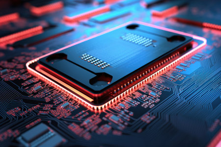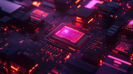 Closeup of an illuminated microchip on a detailed printed circuit board in vibrant colors