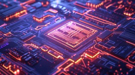 Closeup of a futuristic circuit board with a radiant central processor and intricate connections
