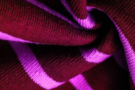 Background texture of roll of pink purple pattern stitch knitted fabric made of wool. Close up.